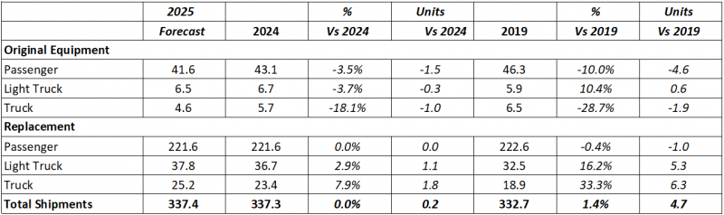 与2024年相比,乘用车、轻型卡车和卡车轮胎的原始设备(OE)出货量预计将分别下降3.5%、3.7%和18.1%,总计减少280万条;替换市场乘用车、轻型卡车和卡车轮胎的出货量预计分别增长0%、2.9%和7.9%,总计增加300万条。